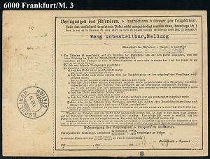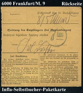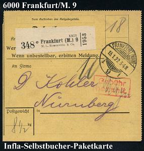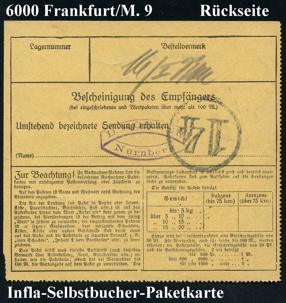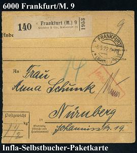 441 | 18 € | 6 Frankfurt/M. Post-Freistempel : FRANKFURT/ *(MAIN) 9/ x 1922 (5.5.) 1K-Brücke + roter Ra.: Gebühr bezahlt + schw. Selbstbucher-Paketzettel: Frankfurt (M.) 9/ Richter & Co., Kaiserstr.74 , Infla-Paketkt. n. Nürnberg, rs. AS. | ![]() ![]() | |