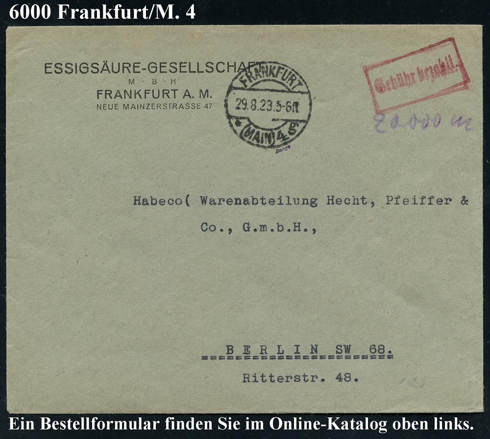 443 | 16 € | 6 Frankfurt/M. Post-Freistempel : FRANKFURT/ *(MAIN)4/ g 1923 (29.8.) 1K-Brücke + roter Ra.: Gebühr bezahlt (20.000 Mk.) Firmen-Bf.: ESSIGSÄURE-GMBH | ![]() | |
