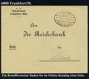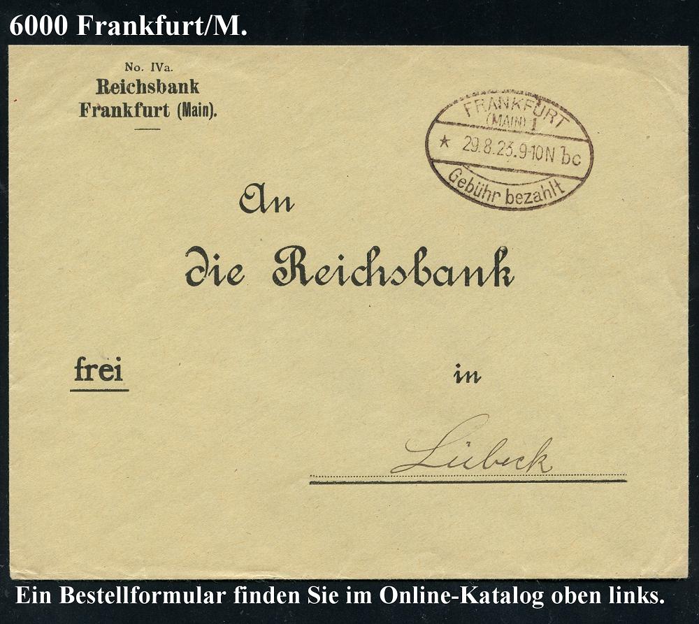 444 | 18 € | 6 Frankfurt/M. Post-Freistempel : FRANKFURT/ (MAIN)1/ *bc/ Gebühr bezahlt 1923 (29.8.) braune Oval-Brücke auf Infla-Dienst-Bf.: Reichsbank n. Lübeck | ![]() | |
