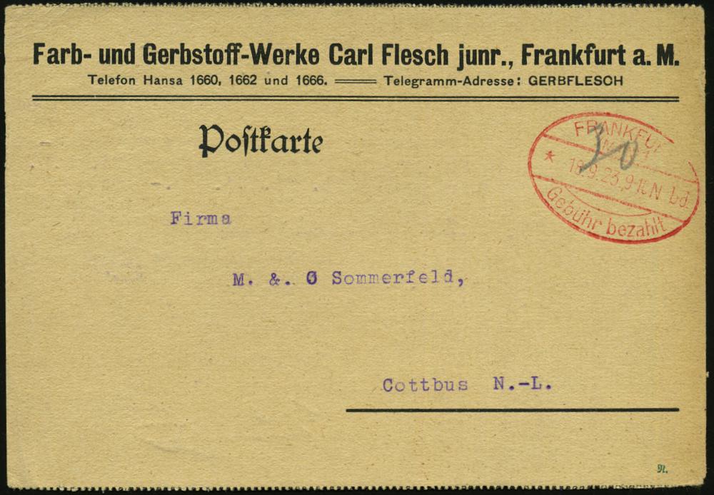 452 | 18 € | 6 Frankfurt/M. Post-Freistempel : FRANKFURT/ (MAIN)/ *bd./ Gebühr bezahlt 1923 (18.9.) PFS Brücken-Oval , bar frankierte Firmen-Infla-Kt: Farb- u.Gerbstoff-Werke Carl Flesch mit Gold-Mark-Preiangabe! (Dü.16) | ![]() | |