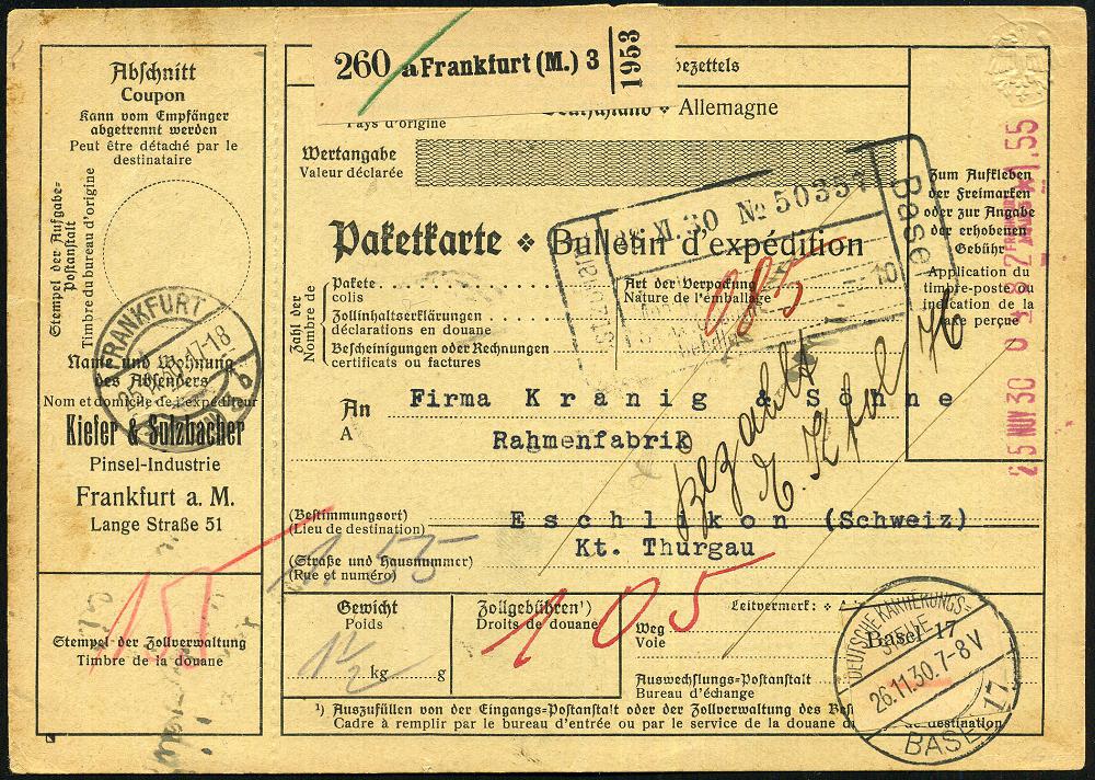 453 | 28 € | 6 Frankfurt/M. Post-Freistempel : FRANKFURT/ MAIN 3 1930 (25.NOV.) viol. Registriekassen-Paket-FS Typ "Anker" *1.55 + Prägeadler horizontal + schw. Paketzettel: a Frankfurt (M.) 3 + 1K: FFM 3/b + 1K: DEUTSCHE KARTIERUNGS-/STELLE/BASEL 17, klar gest. Ausl.-Paketkarte + Abs.-Talon kompl. in die Schweiz (Dü.H1A/2) | ![]() ![]() | |