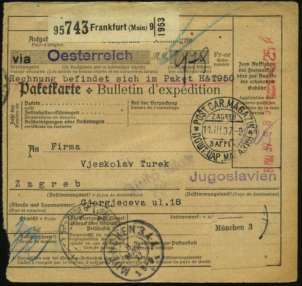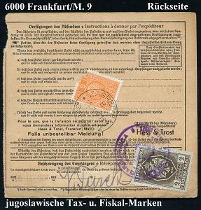 454 | 18 € | 6 Frankfurt/M. Post-Freistempel : Frankfurt/ (Main)9 1937 (6.3.) Registrierkassen-Paket-Freistempel Typ "Anker" *2.25 + Weimarer Prägeadler (horizontal) + schw. Paket-zettel: Frankfurt (Man) 9, Ausl.-Paketkt. (links kl. Ausriß) n. Zagreb + div. TS./AS., rs. jugoslaw. Fiskal- u. Taxmarken (Dü.H-1A/Nr.2) | ![]() ![]() | |