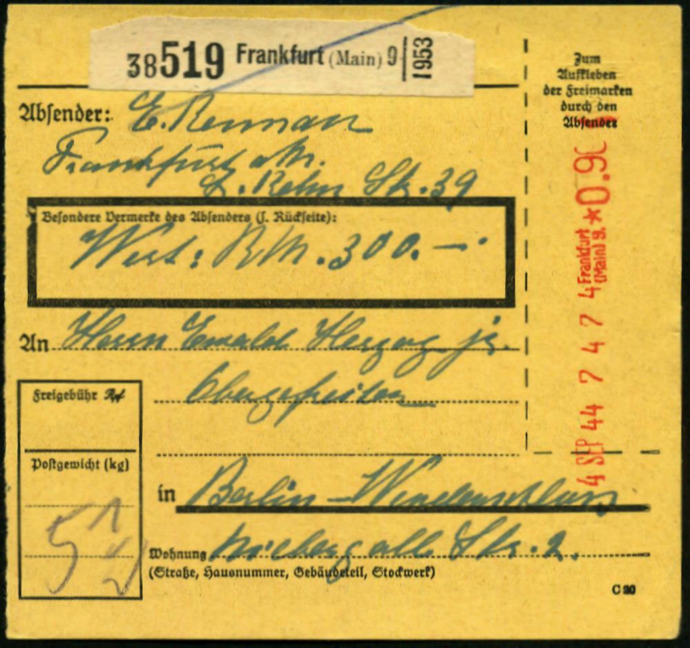 457 | 18 € | 6 Frankfurt/M. Post-Freistempel : Frankfurt/ (Main) 9. 1944 (4.9.) roter Registrierkassen-Paket-FS Typ "Anker" *0.90 RM + NS-Prägeadler horizontal + schw. Paketzettel: Frankfurt (Main) 9, Inl.-Wert-Paketkt. 300.- RM n. Berlin (Dü.H-1A / 2) | ![]() | |