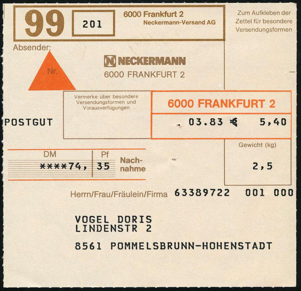 485 | 12 € | 6 Frankfurt/M. Post-Freistempel : 6000 FRANKFURT 2 1983 (März) EDV-Paket-Freistempel 5,40 (DM) im roten Feld (mit kl. vertikalem Posthorn) Selbstbucher-NN-Postgut-Paket-Kt.: NECKERMANN-Versand AG | ![]() | |