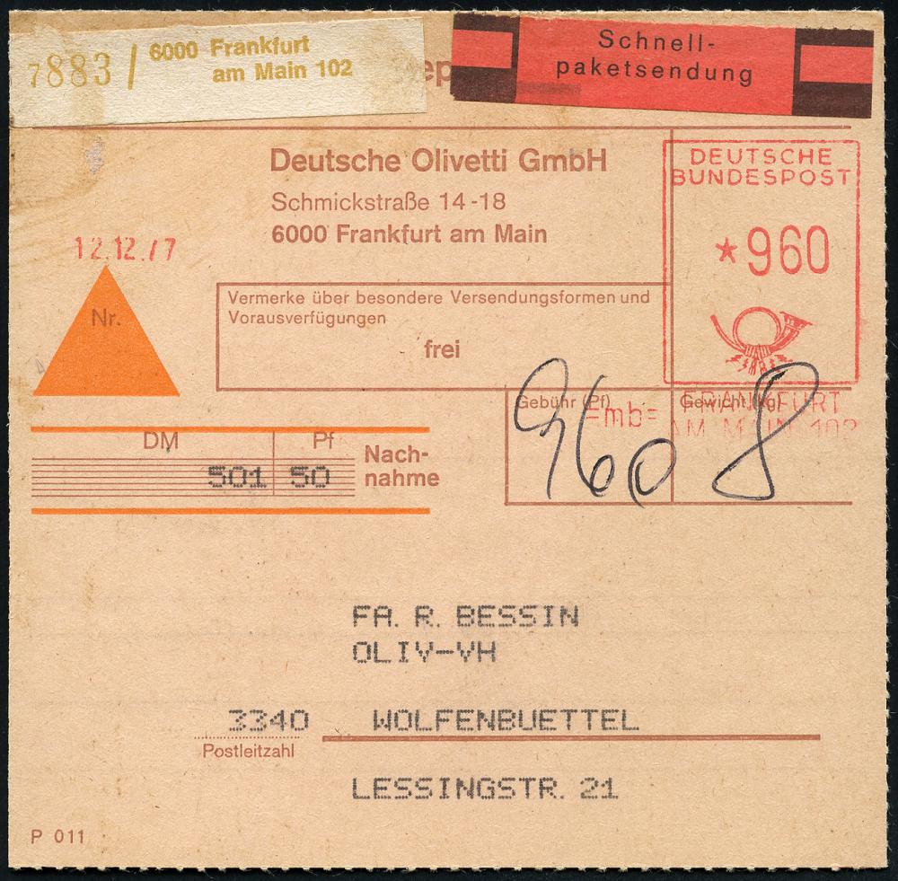 484 | 18 € | 6 Frankfurt/M. Post-Freistempel : FRANKFURT/ AM MAIN 102 1977 (12.12.) Paket-FS *960 Pf. + brauner Paketzettel: 6000 Frankfurt/am Main 102 + Label: Schnell-/paketsendung, Inl.-Schnell-Paket-Kt.: Deutsche Olivetti GmbH, seltene Portostufe! (Dü.H-6 C) | ![]() | |