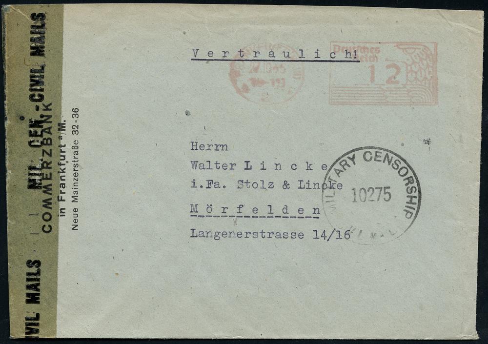 461 | 25 € | 6 Frankfurt/M. Post-Freistempel : FRANKFURT (MAIN)/ *2I/ Deutsches/ Reich 1945 (27.10.) aptierter PFS 12 Pf. "Adlerkopf/Hakenkreuz", nur Hakenkreuz entfernt + schw. US-Zensur-1K: MILITARY CENSORSHIP/10275 + Zensur-Klebestreifen (= Offenbach) Firmen-Zensur-Bf. n. Mörfelden (Dü.D-8, Nr.225) | ![]() | |