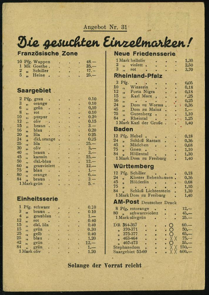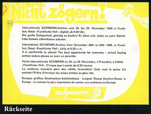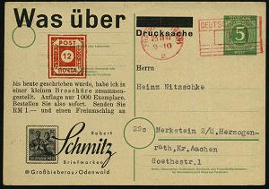 469 | 23 € | 6 Frankfurt/M. Post-Freistempel : FRANKFURT (MAIN)/ 2/ DEUTSCHE POST 1947 (23.11.) PFS 1 Pf. zur Aufwertung auf Orts-P. 5 Pf. Ziffer (P 950) + Reklame-Zudruck: Rob. Schmitz Briefmarken, Großbieberau/Odenw. mit Abb.: 16 Pf. Arbeiter u. SBZ 12 Pf. "POSCHTA" (rs. Preisliste), Bedarf! (Dü.248) | ![]() ![]() | |