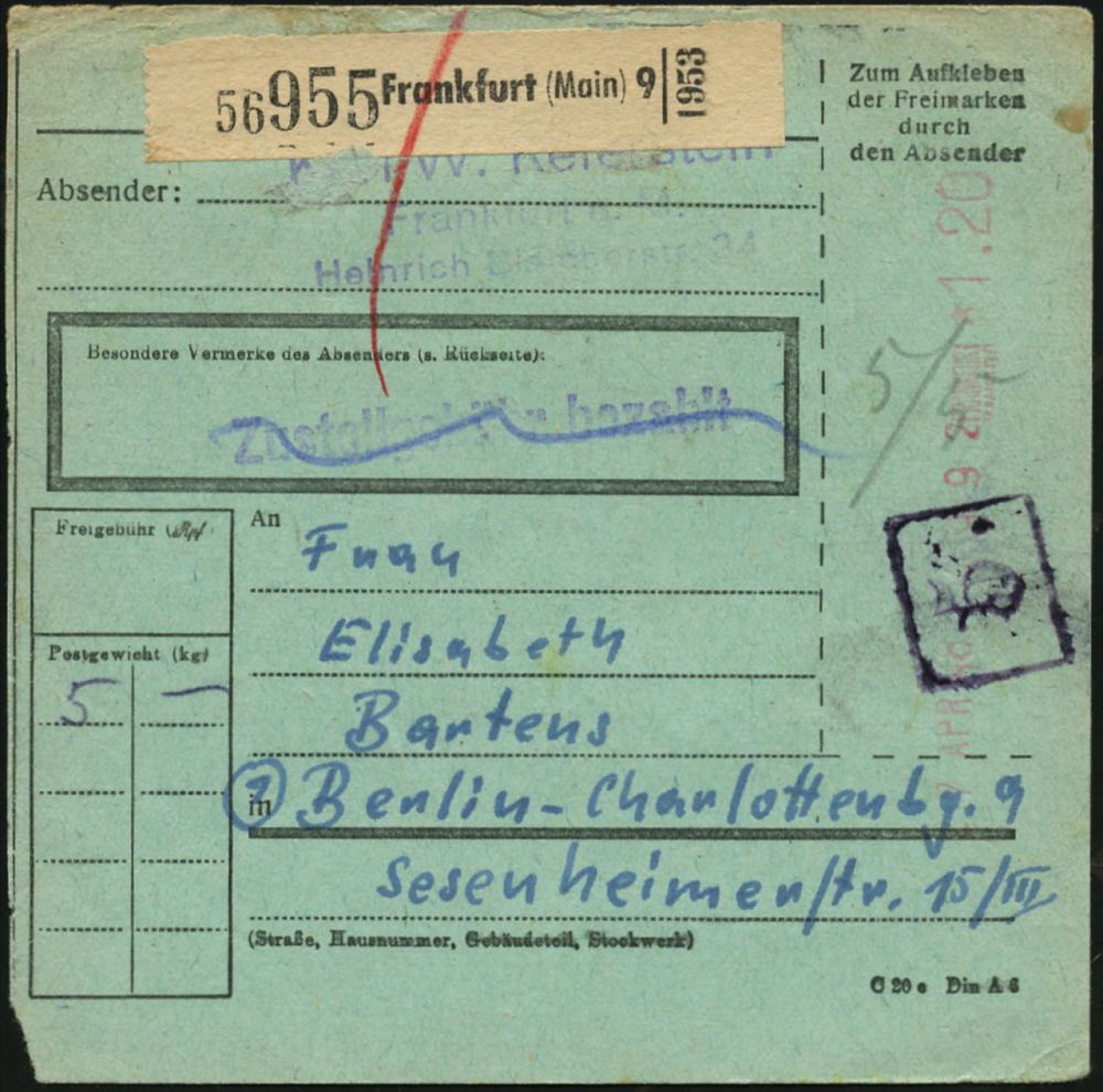 471 | 18 € | 6 Frankfurt/M. Post-Freistempel : FRANKFURT/ (MAIN) 9 C 1948 (7.4.) Registrierkassen-Paket-FS Typ "Anker" *1.20 RM , NS-Prägeadler abgeschliffen + schw. Paketzettel: Frankfurt (Main) 9, grüne Postgut-Paketkt. n. West-Berlin (Dü.H-1A/2 weiterverwendet) | ![]() | |