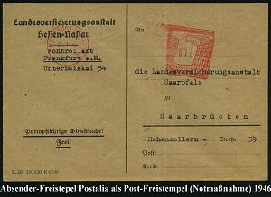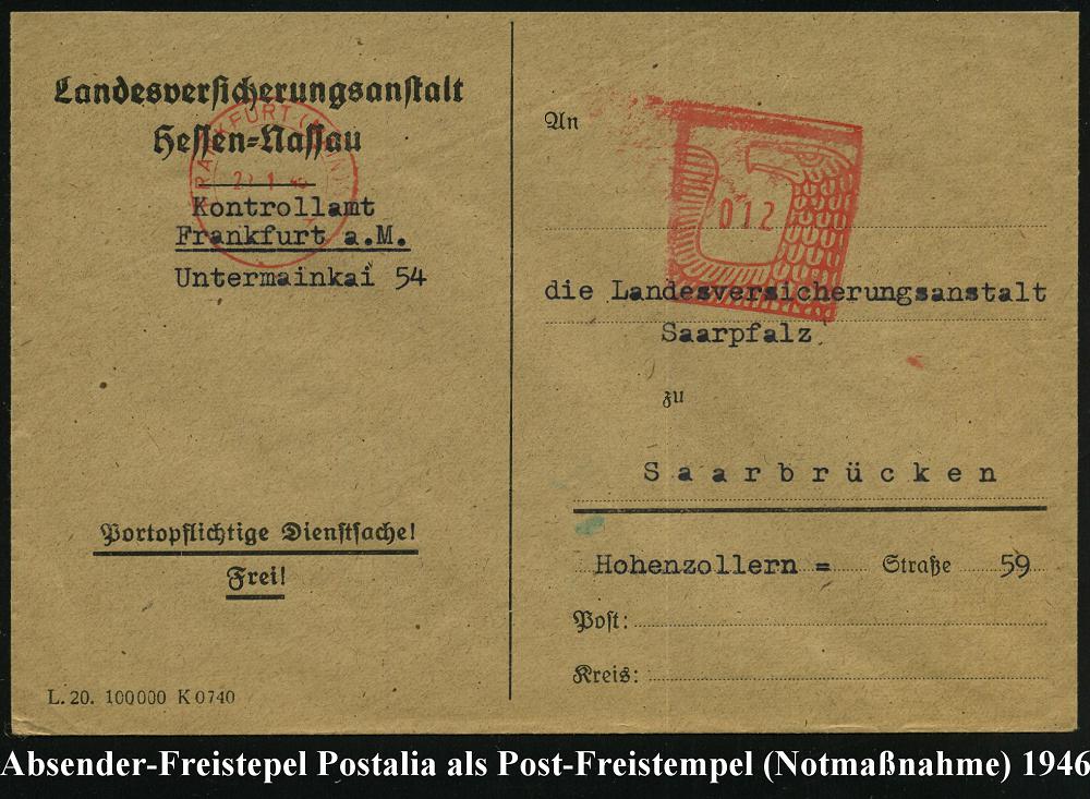 464 | 25 € | 6 Frankfurt/M. Post-Freistempel : FRANKFURT (MAIN) 1/ Deutsche Reichspost 1946 (23.1.) AFS Postalia "Adlerkopf" 012 Pf. unverändert als Post-FS verwendet = Notmaßnahme , Dienst-Bf.: Landesversicherungsanstalt Hessen-Nassau n. Saarbrücken (Dü.E-9 unverändert) | ![]() | |