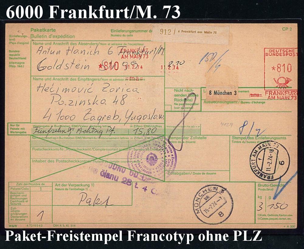 482 | 18 € | 6 Frankfurt/M. Post-Freistempel : FRANKFURT/ AM MAIN 73 =ma= 1974 (11.2.) Paket-FS "Francotyp" *810 Pf. + brauner Paketzettel: 6 Frankfurt am Main 73 + 1K: 6 FRANKFURT AM MAIN 73/f, klar gest. Ausl.-Paketkt. n.Zagreb (Dü.H-6A = seltene Type!) | ![]() | |