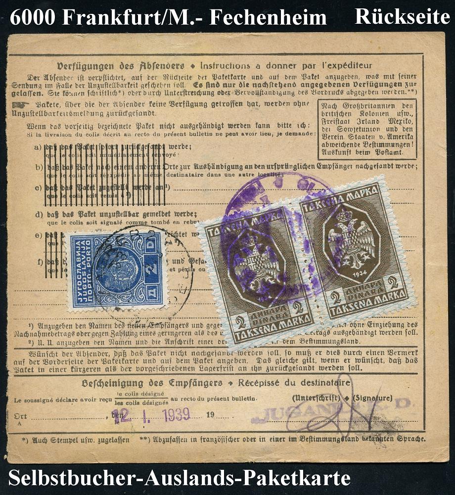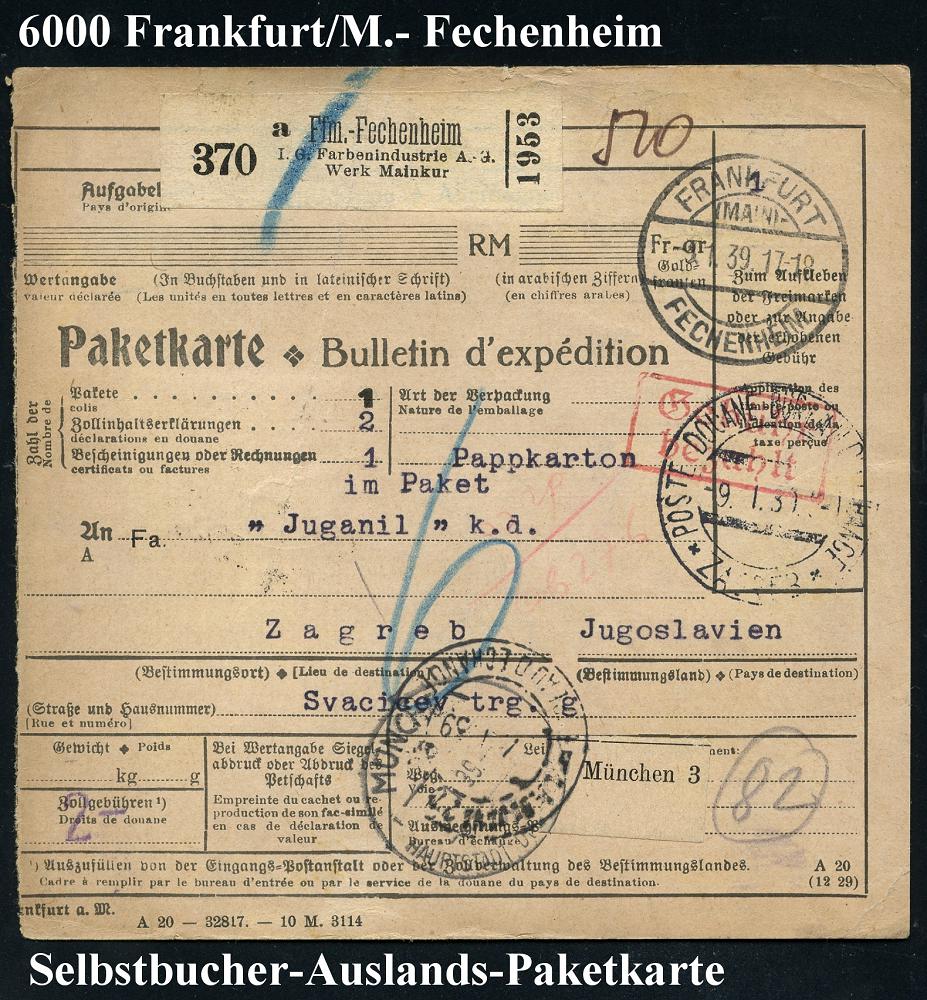 455 | 25 € | 6 Frankfurt/M. Post-Freistempel : FRANKFURT/ (MAIN)-/ FECHENHEIM 1939 (9.1.) 1K-Brücke + roter Ra.2: Gebühr/bezahlt + schw. Selbstbucher-Paketzettel: Ffm.-Fechenheim/ I.G.-Farbenindustrie A.-G./ Werk Mainkur , Ausl.-Selbstbucher-Paketkarte (kl. natürliche Falte kaum sichtbar) div. TS. n. Zagreb, rücks. jugoslaw. Tax- u. Firkalmarken | ![]() ![]() | |