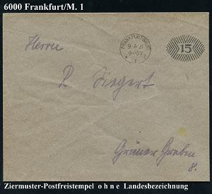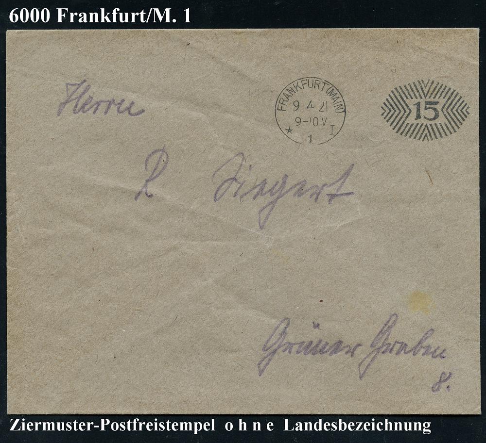 487 | 16 € | 6 Frankfurt/M. Post-Freistempel : FRANKFURT (MAIN)/ * 1 I/ 15 1921 (9.4.) PFS Ziermuster 15 Pf. schwarz klar auf Inl.-Bf. (Dü.D-1, Nr.2, UZ I) | ![]() | |