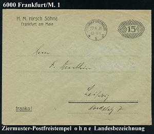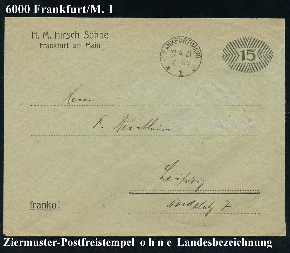 488 | 14 € | 6 Frankfurt/M. Post-Freistempel : FRANKFURT (MAIN)/ * 1 II/ 15 1921 (27.4.) PFS 15 Pf. Ziermuster, schwarz , Firmen-Bf.: H. M. Hirsch Söhne.. (Dü.D-1, Nr.2, UZ II) | ![]() | |