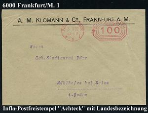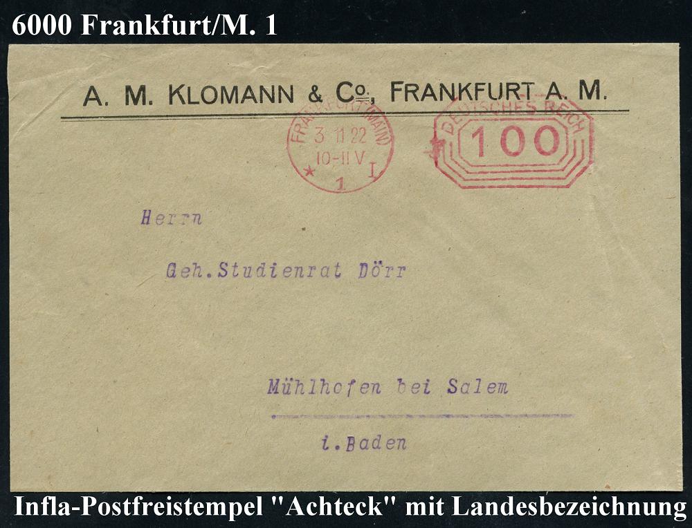 491 | 8 € | 6 Frankfurt/M. Post-Freistempel : FRANKFURT (MAIN)/ * 1 I/ DEUTSCHES REICH 1922 (3.11.) roter PFS "Achteck" 100 Mk. auf Firmen-Vorderseite: A. M. KLOMANN & Cie... (Dü.D-3, Nr.30) | ![]() | |