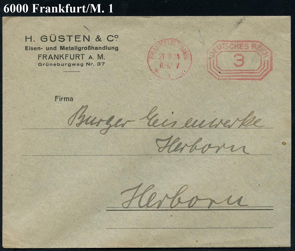 494 | 8 € | 6 Frankfurt/M. Post-Freistempel : FRANKFURT (MAIN/ * 1 I/ DEUTSCHES REICH 1924 (21.8.) PFS 3 Pf. "Achteck" auf Firmen-Bf.: H. GÜSTEN & Co., Eisen- u. Metallgroßhandlung.. (Dü.D-4) | ![]() ![]() | |