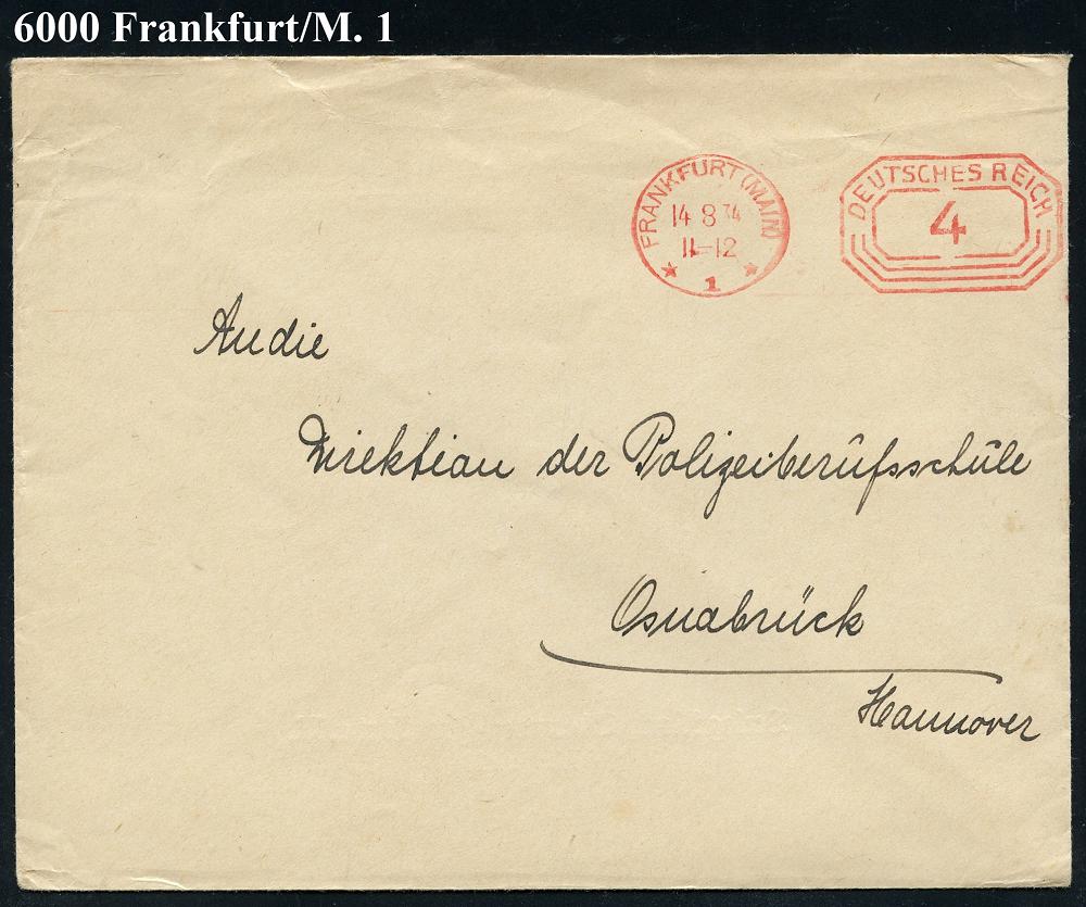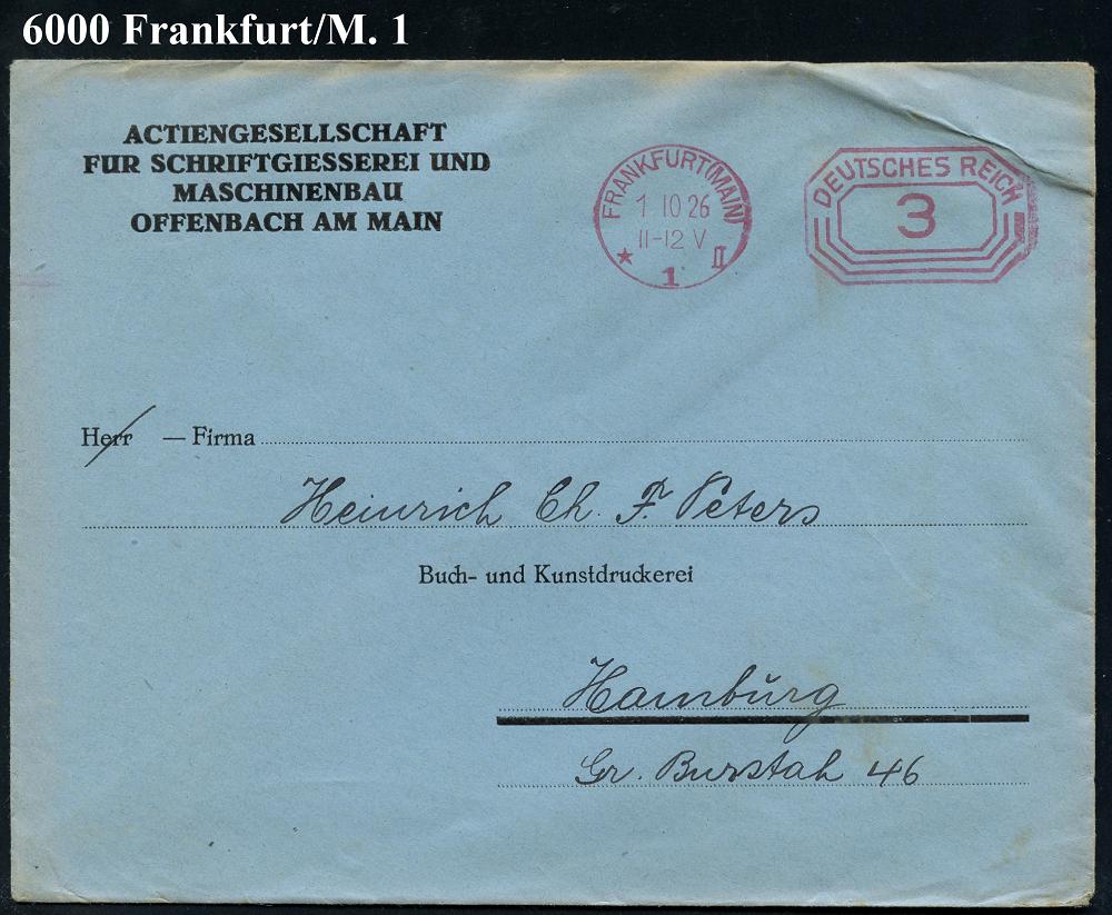 496 | 6 € | 6 Frankfurt/M. Post-Freistempel : FRANKFURT (MAIN)/ * 1 II/ DEUTSCHES REICH 1926 (1.10.) PFS 3 Pf. "Achteck" auf Firmen-Bf.: AG FÜR SCHRIFTGIESSEREI U. MASCHINENBAU, OFFENBACH AM MAIN (Dü.D-4) | ![]() ![]() | |