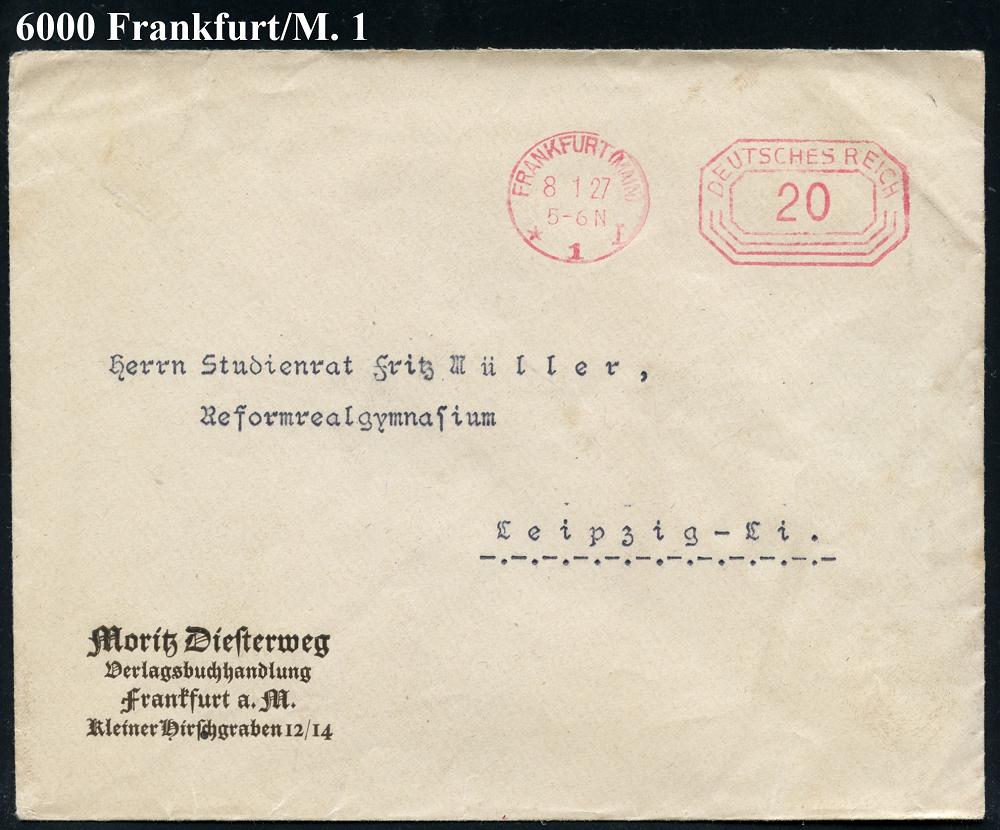 497 | 18 € | 6 Frankfurt/M. Post-Freistempel : FRANKFURT (MAIN)/ * 1 I/ DEUTSCHES REICH 1927 (8.1.) PFS 20 Pf. "Achteck" auf Firmen-Bf.: Moritz Diesterweg, Verlagsbuchhandlung.., seltene Portostufe! = Gew.-Stufe Fernbrief bis 100 g.! (Dü.D-4) | ![]() ![]() | |