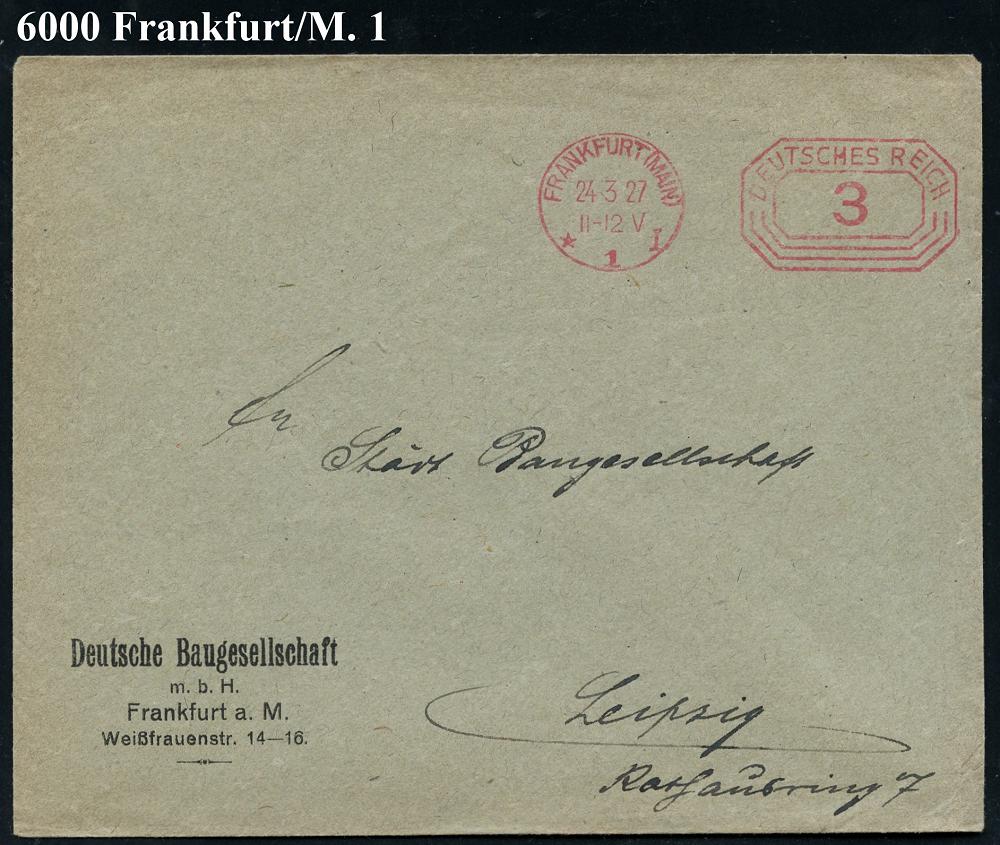 498 | 6 € | 6 Frankfurt/M. Post-Freistempel : FRANKFURT (MAIN)/ * 1 I/ DEUTSCHES REICH 1927 (24.3.) PFS 3 Pf. "Achteck" auf Firmen-Bf.: Deutsche Baugesellschaft m.b.H. (Dü.D-4) | ![]() ![]() | |