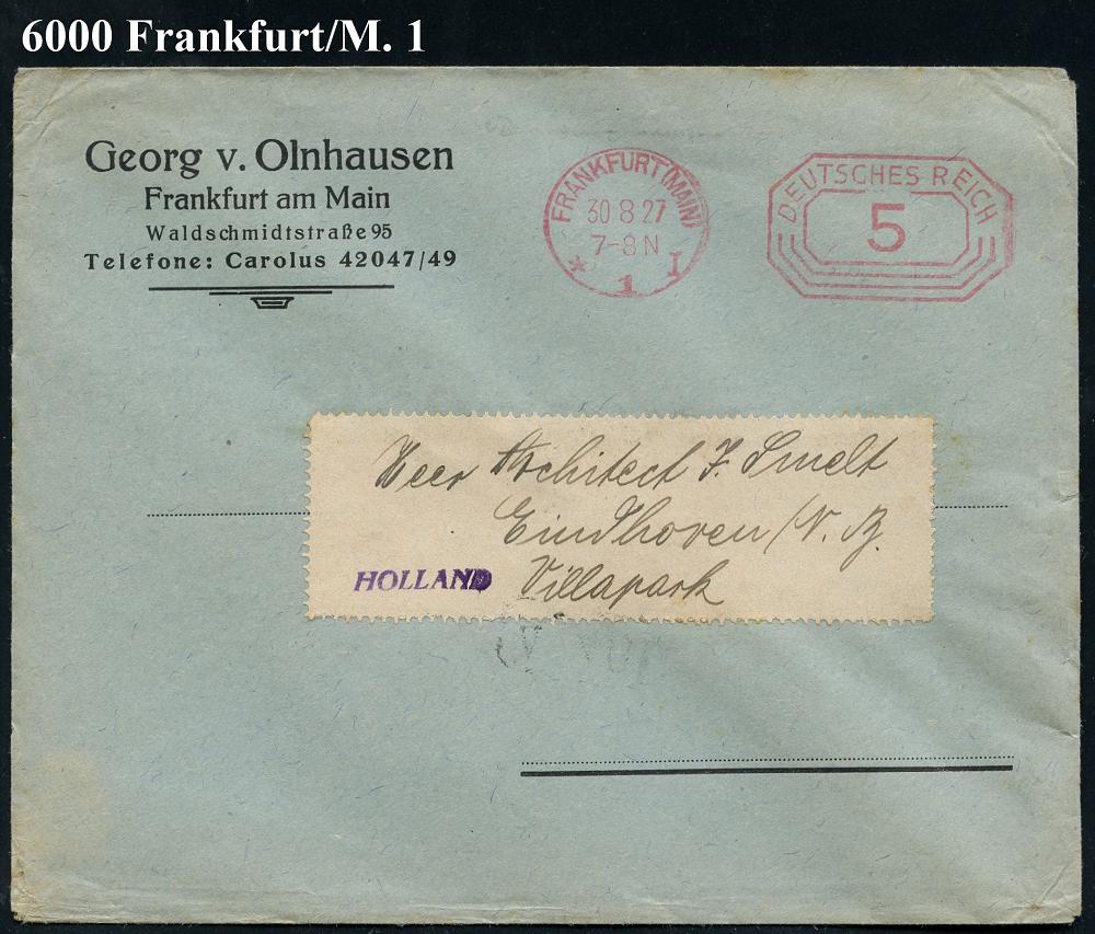 499 | 8 € | 6 Frankfurt/M. Post-Freistempel : FRANKFURT (MAIN)/ * 1 I/ DEUTSCHES REICH 1927 (30.8.) PFS 5 Pf. "Achteck" , Firmen-Bf.: Georg v. Olnhausen.., Ausl.-Drs. n. Holland (Dü.D-4) | ![]() ![]() | |