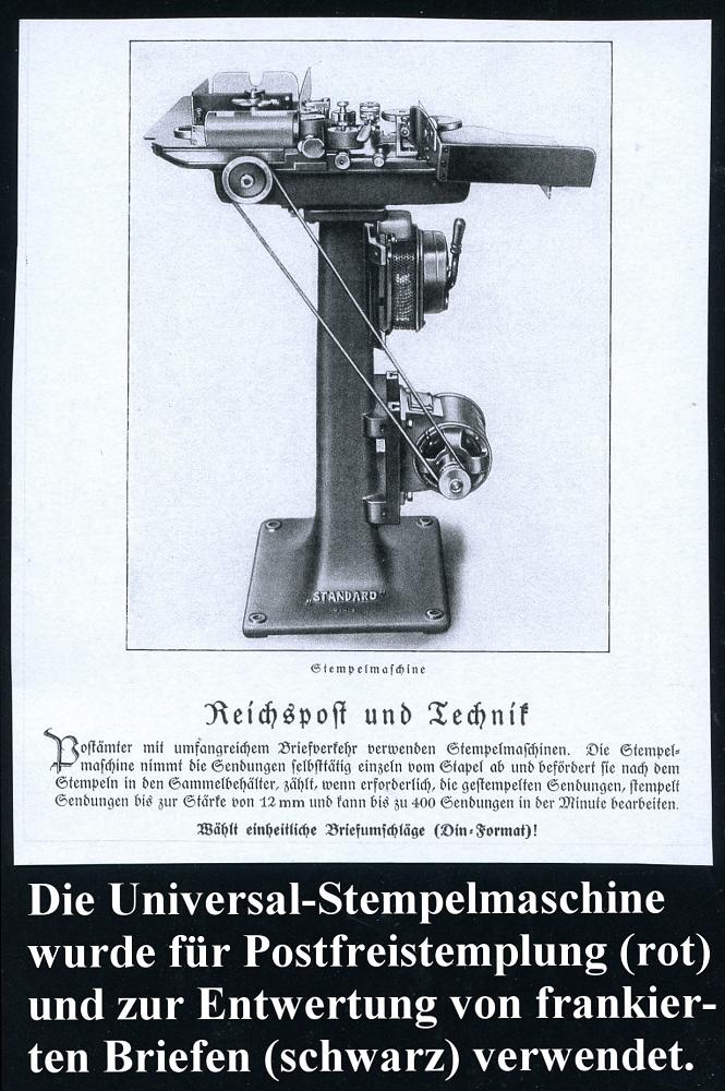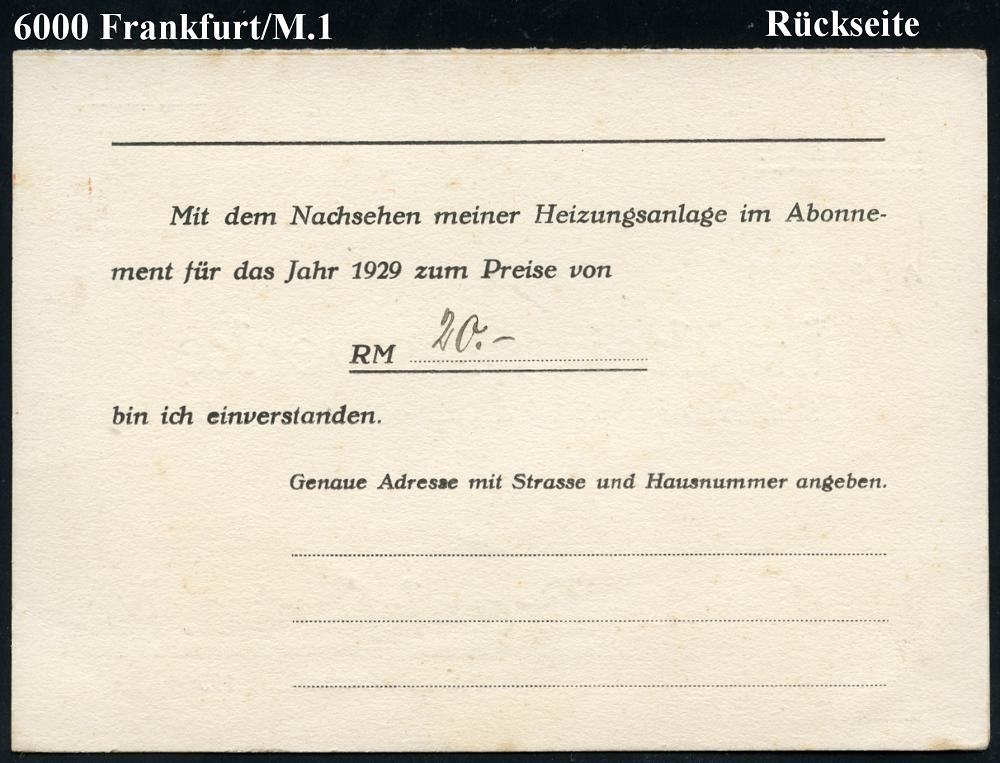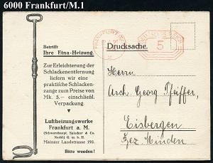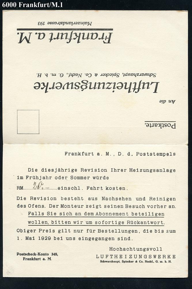 502 | 12 € | 6 Frankfurt/M. Post-Freistempel : FRANKFURT (MAIN)/ 2/ DEUTSCHES REICH 1929 (12.4.) PFS 5 Pf. "Achteck" auf Reklame-Klappkarte: Luftheizungswerke Schwarzhaupt, Spiecker & Co.. mit techn. Apparat, ungebr. Antwort anhängend (Dü.D-4) | ![]() ![]() ![]() ![]() | |