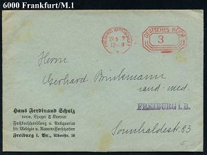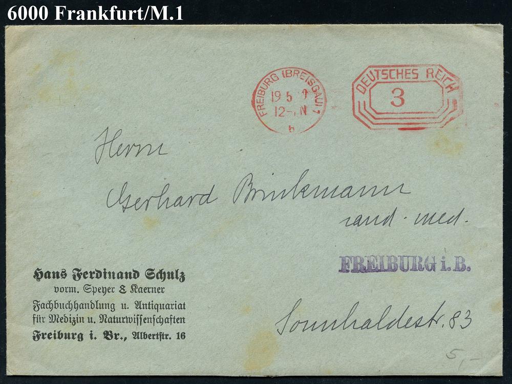 503 | 6 € | 6 Frankfurt/M. Post-Freistempel : FRANKFURT (MAIN) 1/ b/ DEUTSCHES REICH 1929 (19.5.) PFS 3 Pf. "Achteck" auf Firmen-Bf.: Hans Ferdinand Schulz, vorm. Speyer u. Kaerner, Fachbuchhandlung u. Antiquariat für Medizin u. Naturwissenschaften (Dü.D-4) | ![]() ![]() | |