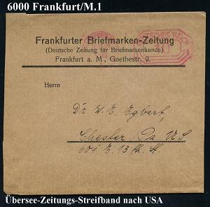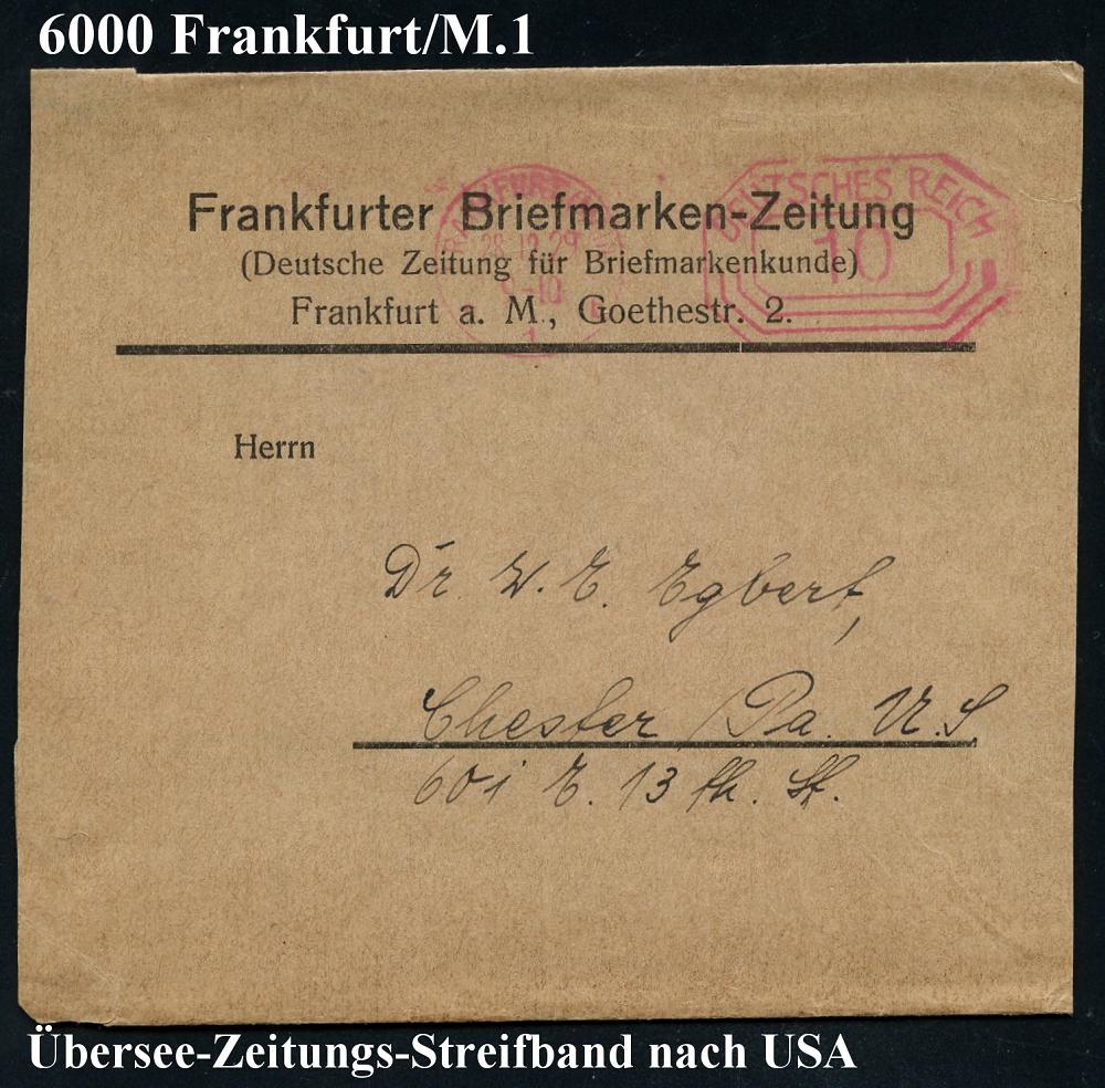 504 | 15 € | 6 Frankfurt/M. Post-Freistempel : FRANKFURT (MAIN)/ *1b/ DEUTSCHES REICH 1929 (2812.) PFS 10 Pf. "Achteck" auf Zeitungs-Streifband: Frankfurter Briefmarken-Zeitung.. n. Chester, USA = Ausl.-Tarif ! (Dü.D-4) | ![]() ![]() | |