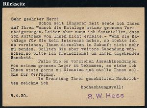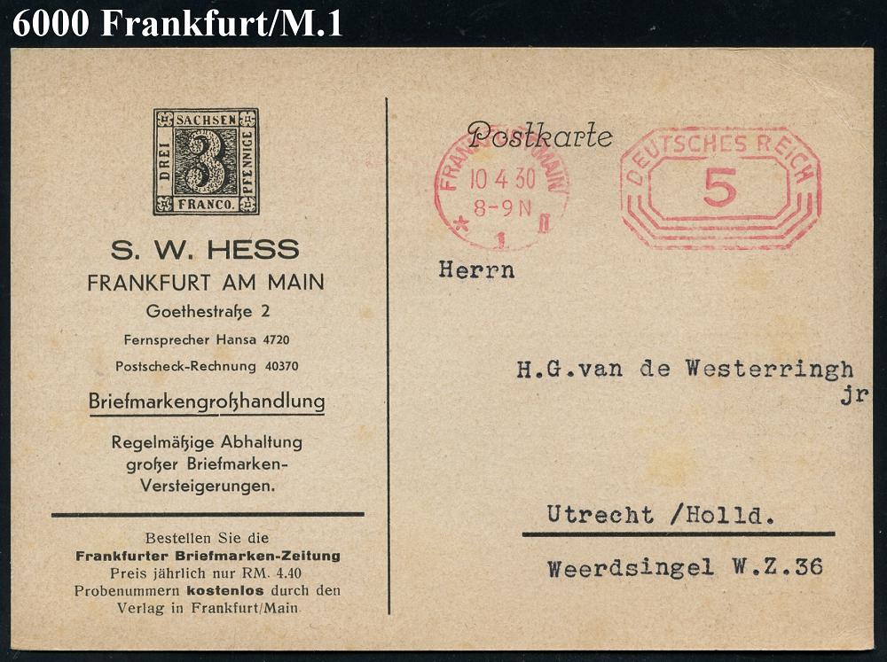 505 | 10 € | 6 Frankfurt/M. Post-Freistempel : FRANKFURT (MAIN)/ * 1 II/ DEUTSCHES REICH 1930 (10.4.) PFS 5 Pf. "Achteck" auf Reklame-Kt.: S. W. HESS.. Briefmarken-großhandlung.. mit Sachsen Nr. 1 (3 Pf.) n. Utrecht = Ausl.-Drs.-Tarif (Dü.D-4) | ![]() ![]() ![]() | |