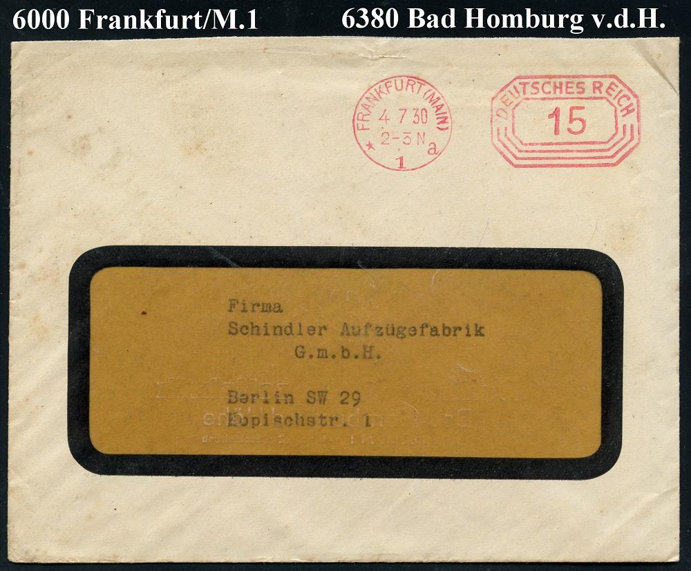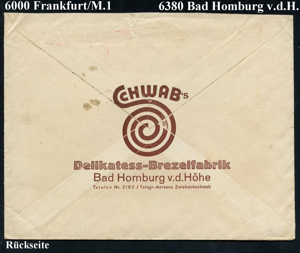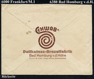 506 | 10 € | 6 Frankfurt/M. Post-Freistempel : FRANKFURT (MAIN)/ * 1 a/ DEUTSHES REICH 1930 (4.7.) PFS 15 Pf. "Achteck" auf Fern-Firmen-Bf., rs. Abs.-Vordruck: SCHWAB Delikatess-Brezelfabrik, Bad Homburg.. (Firmen-Logo) = Tarif Fern-Bf.! (Dü.D-4) | ![]() ![]() ![]() | |