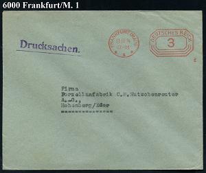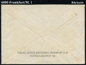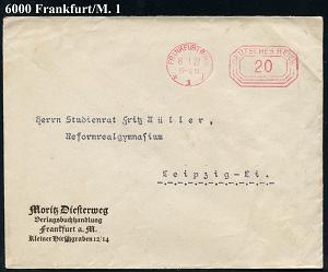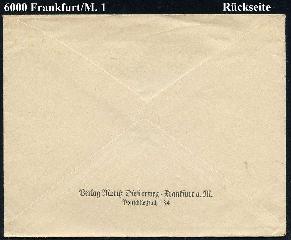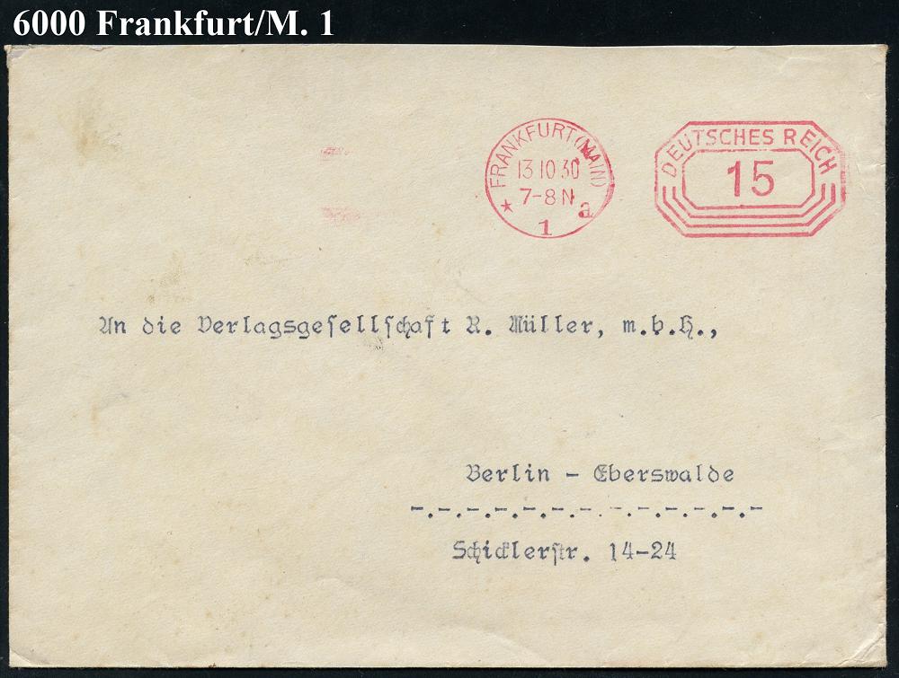 508 | 6 € | 6 Frankfurt/M. Post-Freistempel : FRANKFURT (MAIN)/ * 1 a/ DEUTSCHES REICH 1930 (13.10.) PFS 15 Pf. "Achteck" , rs. Abs.-Vordruck: VERLAG MORITZ DIESTERWEG.. = Fern-Bf.-Tarif (Dü.D-4) | ![]() ![]() ![]() | |