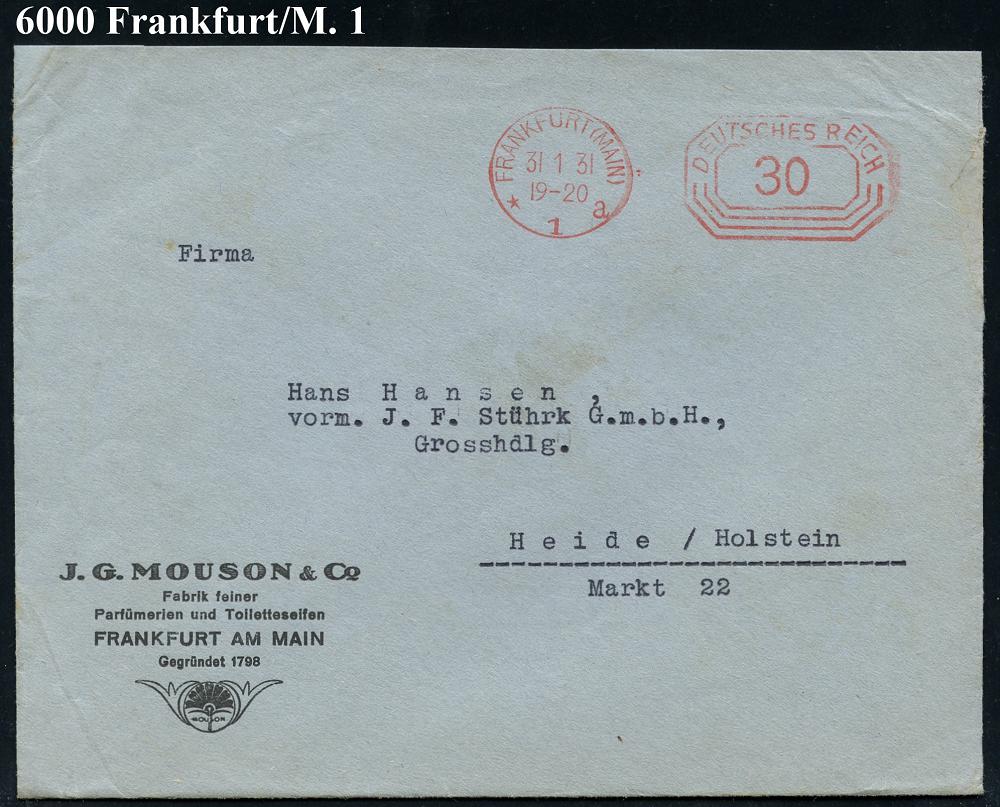 509 | 18 € | 6 Frankfurt/M. Post-Freistempel : FRANKFURT (MAIN)/ * 1 a/ DEUTSCHES REICH 193! (§!:!:) PFS 30 Pf. "Achteck" auf Firmen-Reklame-Bf.: J. G. MOUSON & Co., Fabrik feiner Parfümerien u. Toilettenseifen.., rs. Reklame: ZAHNCREME MOUSON = 3. Gew.-Stufe ab 100 g.! (Dü.D-5) | ![]() ![]() | |