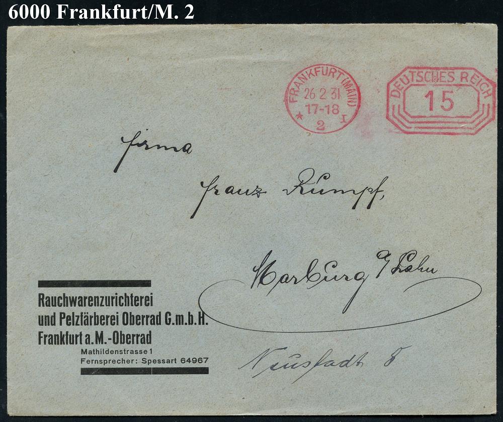 510 | 8 € | 6 Frankfurt/M. Post-Freistempel : FRANKFURT (MAIN)/ * 2 I/ DEUTSCHES REICH 193! (26.2.) PFS 15 Pf. "Achteck" auf Firmen-Bf.: Rauchwarenzurichterei u. Peltfärberei Oberrad GmbH.. (Dü.D-4) | ![]() ![]() | |