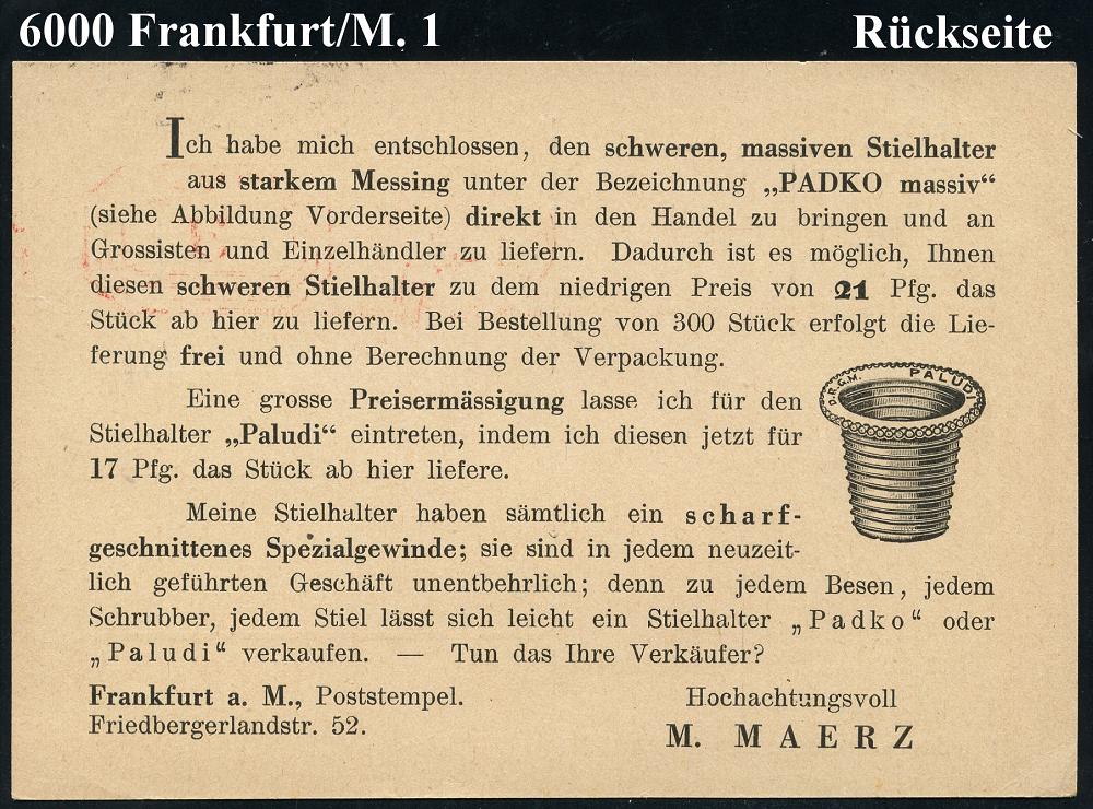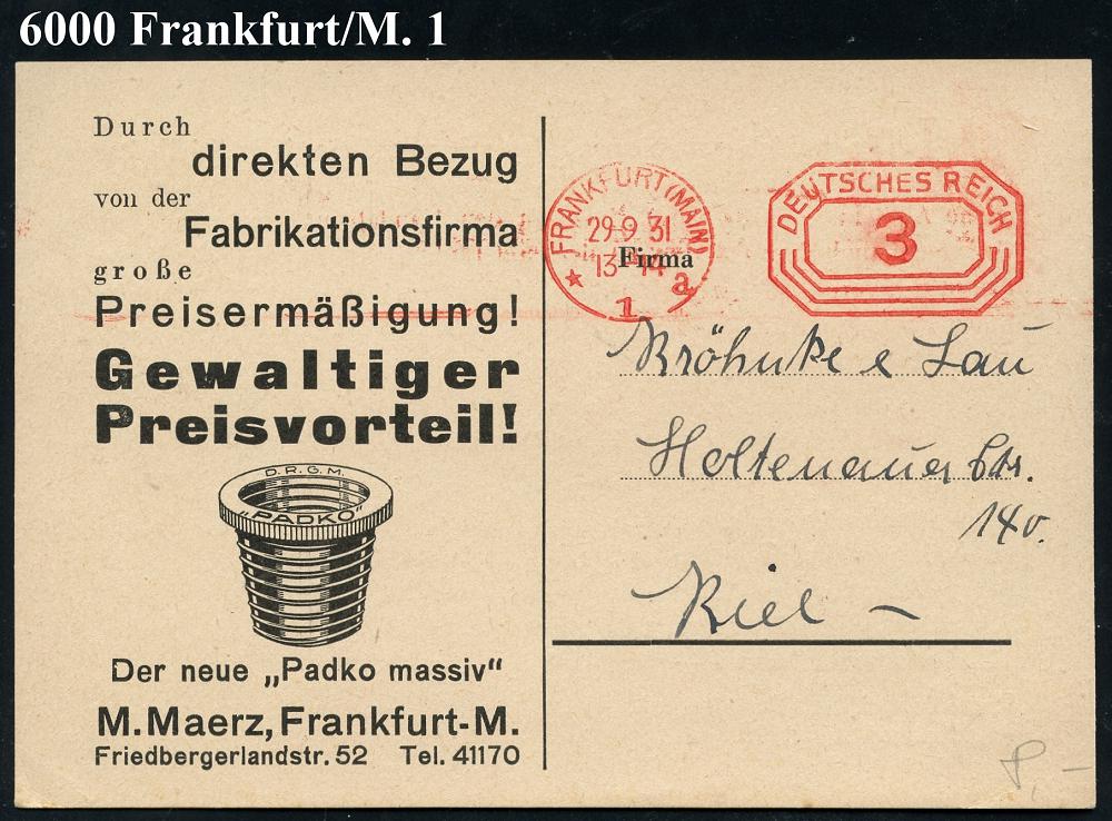 511 | 15 € | 6 Frankfurt/M. Post-Freistempel : FRANKFURT (MAIN)/ * 1 a/ DEUTSCHES REICH 193! (29.9.) PFS 3 Pf. "Achteck" auf Reklame-Kt.: M. Maerz.. "Padko massiv" = Patent-Stielhalter D,R.G.M. (auch rs.) Drs.-Karte (Dü.D-4) | ![]() ![]() ![]() | |