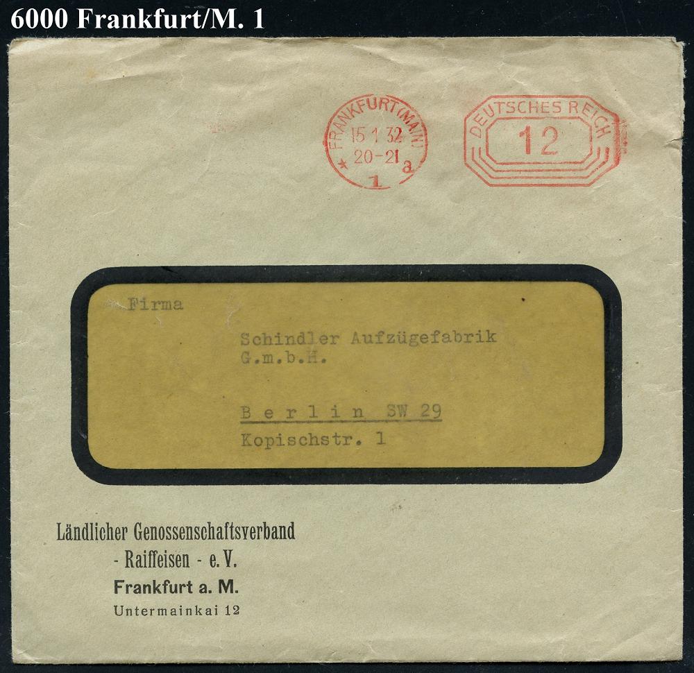 512 | 10 € | 6 Frankfurt/M. Post-Freistempel : FRANKFURT (MAIN)/ * 1 a/ DEUTSCHES REICH 1932 (15.9.) PFS 12 Pf. "Achteck" = neuer Fern-Bf.-Tarif ab 15.1.1932 , Vordruck-Bf.: Ländlicher Genossenschaftsverband Raiffeisen e.V. | ![]() ![]() | |