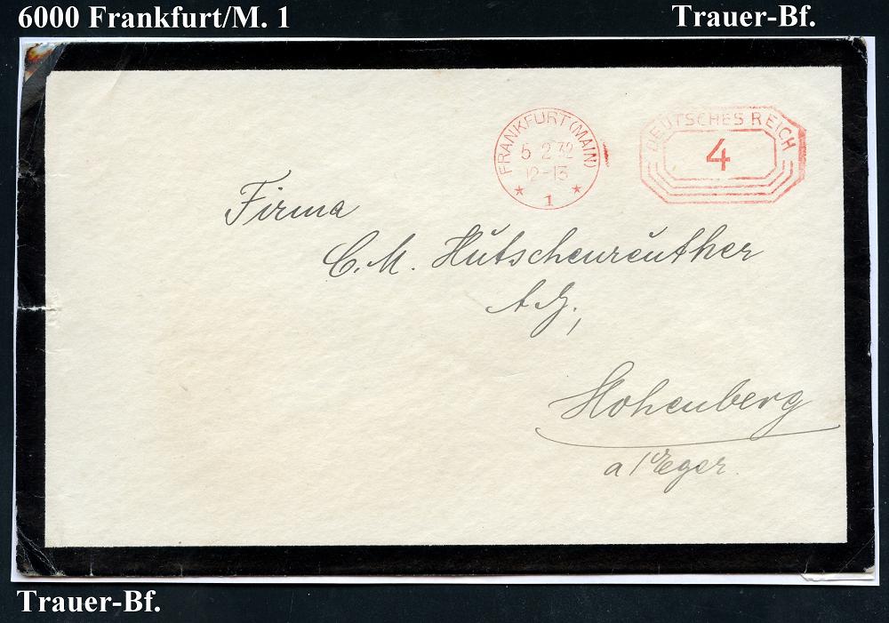 513 | 8 € | 6 Frankfurt/M. Post-Freistempel : FRANKFURT (MAIN)/ * 1 */ DEUTSCHES REICH 1932 (5.2.) PFS 4 Pf. "Achteck" auf Trauer-Bf. (kl. Rißchen) an Porzellanmanufaktur Hutschenreuther (Dü.D-4) | ![]() ![]() | |