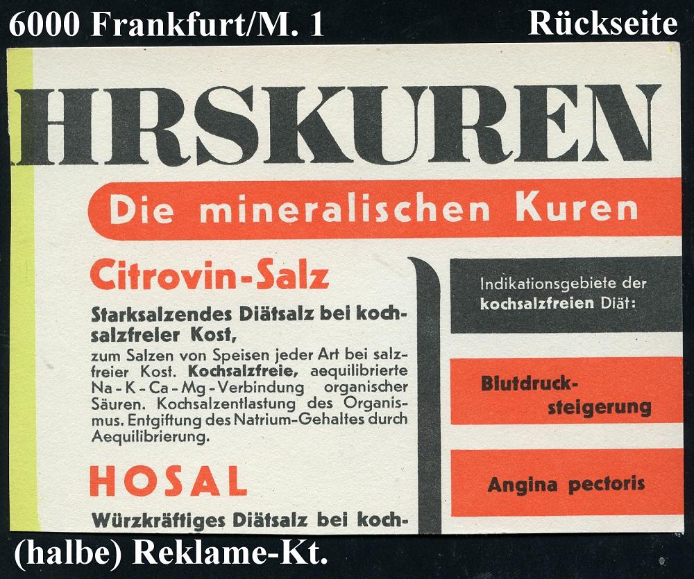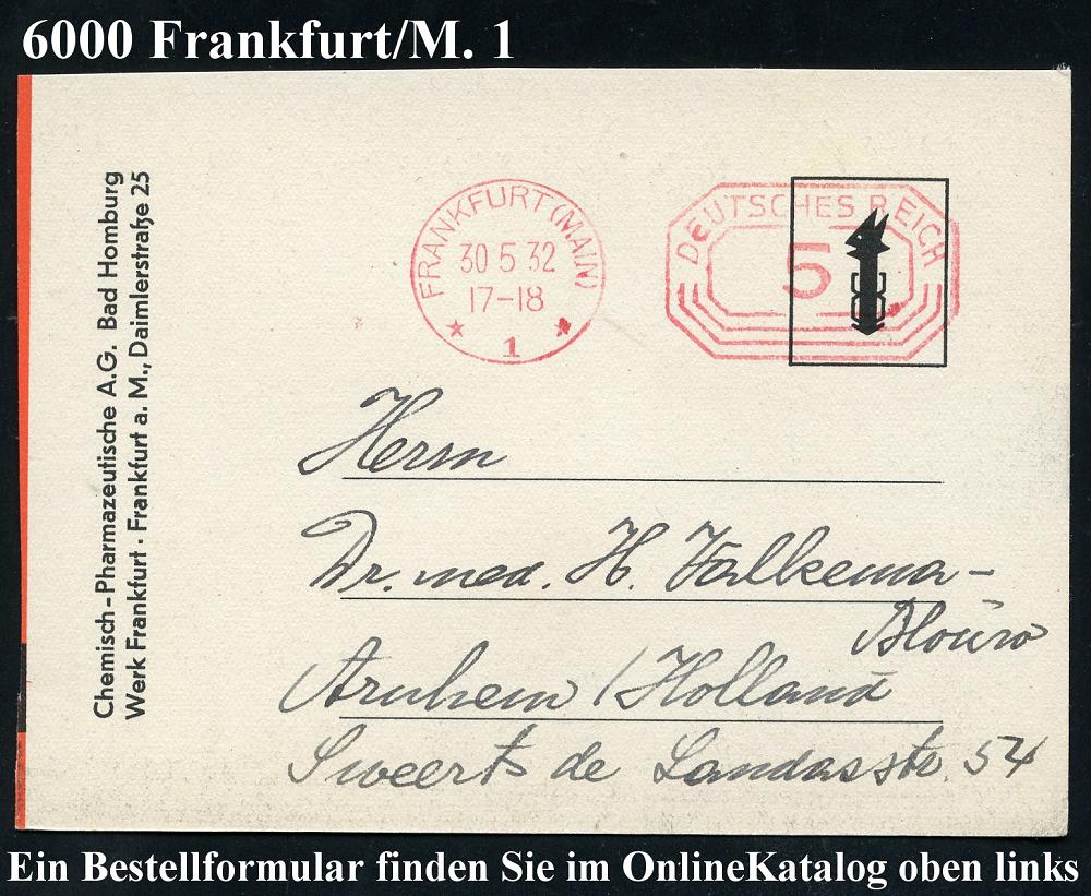 514 | 10 € | 6 Frankfurt/M. Post-Freistempel : FRANKFURT (MAIN)/ *1*/ DEUTSCHES REICH 1932 (30.5.) PFS 5 Pf. "Achteck" auf (etw. verküruzter) Reklame-Kt.: Chem.-Pharmazeut. A.G., Bad Homburg.. (Citrovin-Salz) Ausl.-Drs. n. Holland (Dü.D-4) | ![]() ![]() ![]() | |
