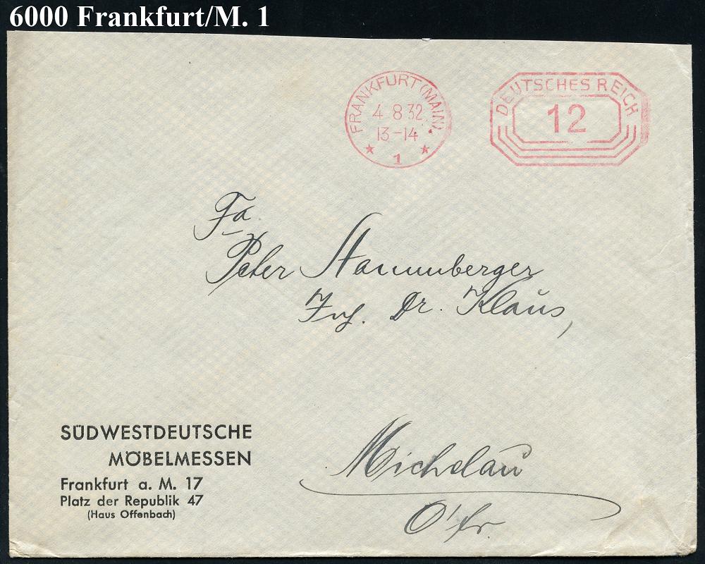 516 | 10 € | 6 Frankfurt/M. Post-Freistempel : FRANKFURT (MAIN)/ *1*/ DEUTSCHES REICH 1932 (4.8.) PFS 12 Pf. "Achteck" auf Firmen-Bf.: SÜDWESTDEUTSCHE MÖBELMESSEN.. = Fern-Bf.-Porto ! (Dü.D-4) | ![]() ![]() | |