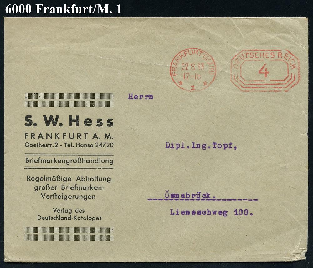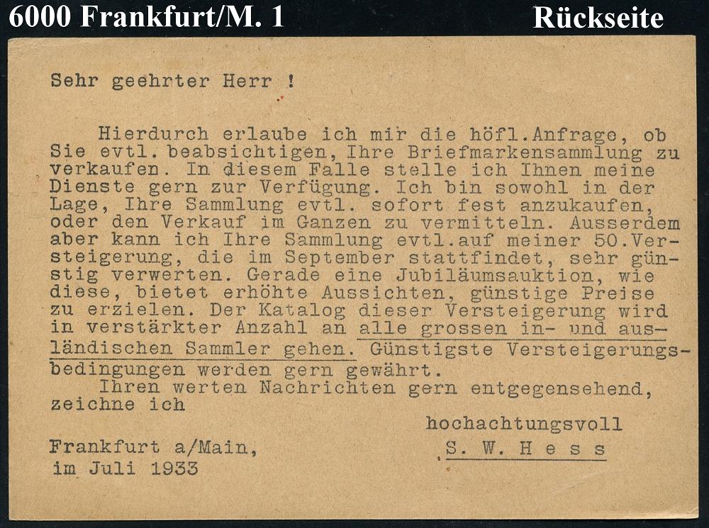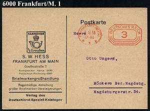 518 | 10 € | 6 Frankfurt/M. Post-Freistempel : FRANKFURT (MAIN)/ *1*/ DEUTSCHES REICH 1933 (9.8.) PFS 3 Pf. "Achteck" auf Reklame-Kt.: S. W. HESS.. Briefmarken-großhandlung.. (Alt-Hannover 1/2 Groschen), Inl.-Drs. (Dü.D-4) | ![]() ![]() ![]() | |