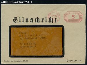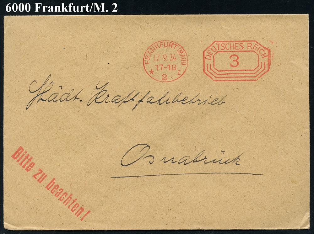 522 | 5 € | 6 Frankfurt/M. Post-Freistempel : FRANKFURT (MAIN)/ * 2 I/ DEUTSCHES REICH 1934 (17.9.) PFS 3 Pf. "Achteck" + toter 1L: Bitte zu beachten!, rs. Abs.-Vordruck: AL GERLACH.. (Dü.D-4) | ![]() ![]() | |