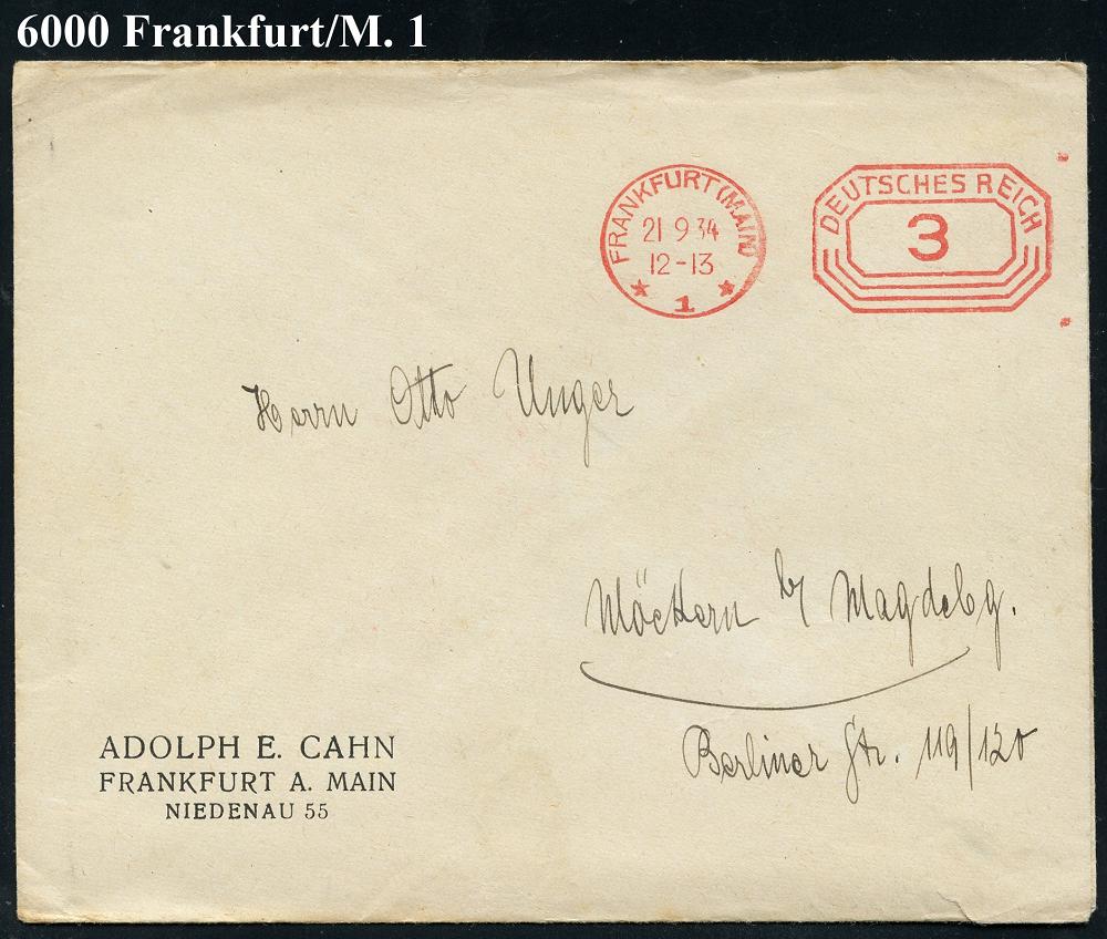 523 | 12 € | 6 Frankfurt/M. Post-Freistempel : FRANKFURT (MAIN)/ *1*/ DEUTSCHES REICH 1934 (21.9.) PFS 3 Pf. , vs. Abs.-Vordruck: ADOLPH E. CAHN.. = jüdischer Absender!, Inl.-Drs. (Dü.D-4) | ![]() ![]() | |