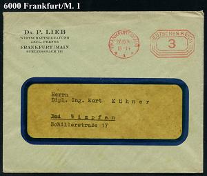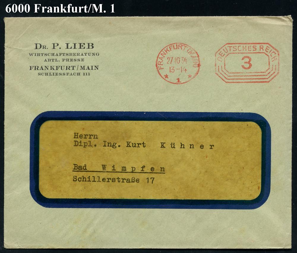 526 | 6 € | 6 Frankfurt/M. Post-Freistempel : FRANKFURT (MAIN)/ *1*/ DEUTSCHES REICH 1934 (27.10.) PFS 3 Pf. "Achteck" , Abs.-Vordruck: DR. P. LIEB, WIRTSCHAFTSBERATUNG, ABTL. PRESSE.. (Dü.D-4) | ![]() ![]() | |