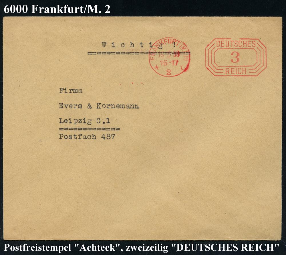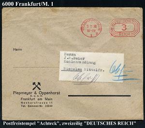 532 | 6 € | 6 Frankfurt/M. Post-Freistempel : FRANKFURT (MAIN)/ 1 u/ DEUTSCHES/ REICH 1938 (11.11.) PFS 3 Pf. "Achteck" (zweizeilig) Firmen-Bf.: Piepmeyer & Oppenhorst GmbH.. (Bergbau-Hämmer) Inl.-Drs. | ![]() ![]() | |