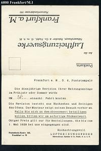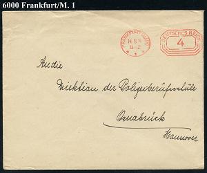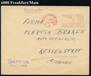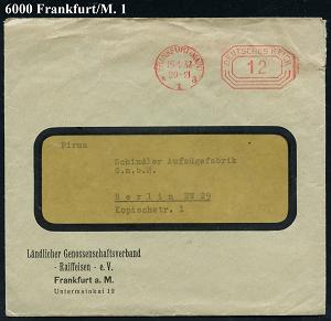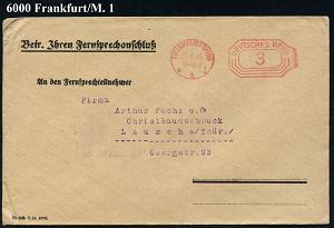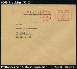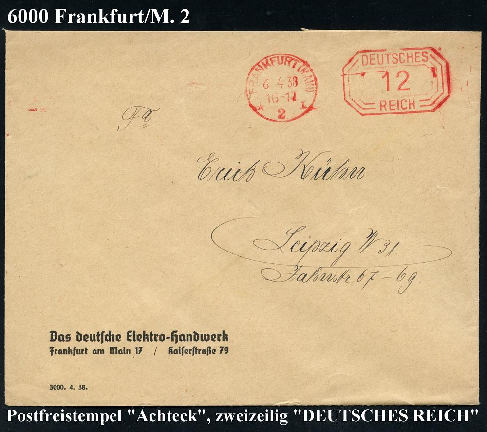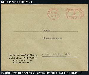 531 | 10 € | 6 Frankfurt/M. Post-Freistempel : FRANKFURT (MAIN)/ 1 u/ DEUTSCHES REICH 1938 (29.10.) PFS 3 Pf. "Achteck" (zweizeilig) Vordruck-Bf.: KANAL- u. WASSERBAU-GES. M.B.H. (Dü.D-5) | ![]() ![]() | |
