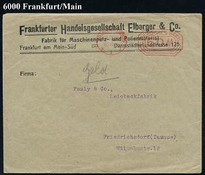 442 | 18 € | 6 Frankfurt/M. Post-Freistempel : FRANKFURT (MAIN)/ *1I/ DEUTSCHES REICH 1923 (31.7.) PFS 60 M. "Achteck" auf Infla-Firmen-Bf.: Frankfurter Handelsgesellschaft Elberger & Co-, Fabrik für Maschinenputz- u. Poliermaterial.. (Dü.D-3, Nr.53) | ![]() | |