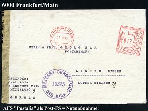 460 | 18 € | 6 Frankfurt/M. Post-Freistempel : FRANKFURT (MAIN) 1/ Deutsche Reichspostpost 1945 (17.10.) aptiierter AFS Postalia "Reichsadler" Antiqua ohne Werbeklischee = Notmaßnahme + viol. US-Zensur-1K: MILITARY CENSORSHIP/10325/ CIVIL MAILS, klar gest. Zensur-Vorderseite (Dü.E-9, unverändert !) | ![]() | |