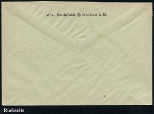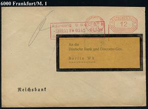 517 | 10 € | 6 Frankfurt/M. Post-Freistempel : FRANKFURT (MAIN)/ *1*/ DEUTSCHES REICH 1933 (4.4.) PFS 12 Pf. "Achteck" , Fern-Dienst-Bf.: Reichsbank an Deutsche Bank u. Disconto-Ges., vs. roter Eingangsstpl. (Dü.D-4) | ![]() ![]() | |