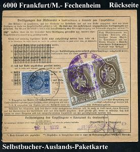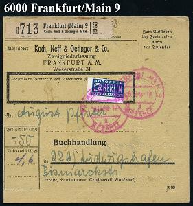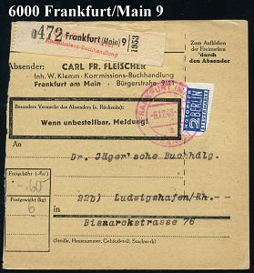 473 | 18 € | 6 Frankfurt/M. Post-Freistempel : FRANKFURT (MAIN) 9/ a/ BEZAHLT 1948 (6.12.) 2K-Steg-PFS auf 2 Pf. NoB (Eckschnitt) + provis. Selbstbucher-Paketzettel: Frankfurt (Main) 9/Calr Fr. Fleischer/ Kommissions-Buchhandlung (roter 2L) Inl.-Selbstbucher-Paketkarte n. Ludwigshafen (Dü.A-7, Nr.32) | ![]() | |