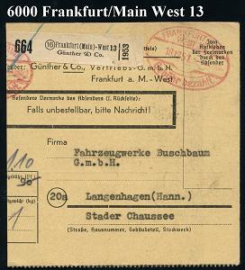 475 | 20 € | 6 Frankfurt/M. Post-Freistempel : FRANKFURT (MAIN)/ WEST 13/ Gebühr bezahlt 1951 (18.12.) Hand-PFS Brücken-Oval + schw. Selbstbucher-Paketzettel: (16) Frankfurt (Main)-West 13/ Günther & Co. , klar gest. Inl.-Selbstbucher-Paketkarte n. Langenhagen (Dü.A-6, Nr.17) | ![]() ![]() | |