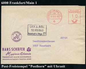 477 | 10 € | 6 Frankfurt/M. Post-Freistempel : 6 FRANKFURT AM MAIN SÜD 10/ sb/ DEUTSCHE/ BUNDESPOST 1963 (8.6.) Maschinen-PFS 10 Pf. Posthorn mit Uhrzeitangabe auf Reklame-Bf.: ALLES FÜR DIE SAUBERKEIT.. HANS SCHÄFER Hygiene-Chemie.. (Zwerg mit Putzeimer) (Dü.D-17) | ![]() | |