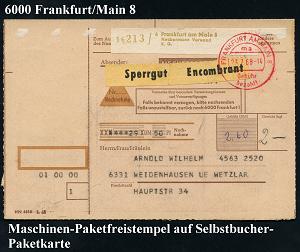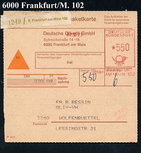 483 | 15 € | 6 Frankfurt/M. Post-Freistempel : =ma= FRANKFURT/ AM MAIN 102 1977 (7.12.) Maschinen-Paket-FS "Francotyp" *550 Pf. + brauner Paketzettel: 6 Frankfurt am Main 102 , Inl.-NN-Paketkt.: Deutsche Olivetti GmbH = Büromaschinen (Dü.H-6C) | ![]() | |