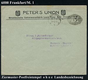 489 | 15 € | 6 Frankfurt/M. Post-Freistempel : FRANKFURT (MAIN)/ * 1 II/ 15 1921 (11.7.) PFS 15 Pf. Ziermuster, schwarz auf Firmen-Bf.: PETERS UNION, Mitteldeutsche Gummiwarenfabrik Louis Peters AG.. (Dü.D-1, Nr.2, UZ II) | ![]() | |